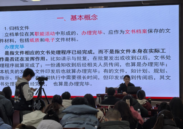 市档案馆汪晋筠围绕“高等学校归档文件收集与整理”主题,详细解读了归档文件的基本概念、归档范围、保管期限、归档时间、归档要求以及高校档案收集归档工作中应注意的问题,强调了非红头文件、特殊载体档案及“账外文件”的收集要点。从纸质归档文件整理步骤的角度出发,重点介绍了档案鉴定、组件、修整、装订、排架注意事项,指导专兼职档案员规范收集整理档案。